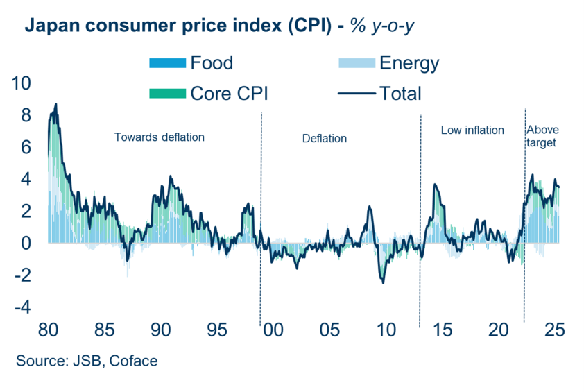 Nach dem Platzen der Spekulationsblase Anfang der 1990er Jahre durchlief Japan zunächst eine Phase rückläufiger Inflationsraten, die schließlich in eine langanhaltende Deflation, einem allgemeinen Rückgang des Preisniveaus, mündete. Der drastische Wertrückgang von Immobilien und Aktien führte dazu, dass Haushalte und Unternehmen den Abbau ihrer nun im Verhältnis höheren Schulden über Konsum und Investitionen stellten – eine Entwicklung, die als „Bilanzrezession“ bezeichnet wird und die Verbraucherpreise konstant niedrig hielt. "In den vergangenen Jahrzehnten kam es zwar vereinzelt zu Inflationsschüben, diese waren jedoch meist temporär und durch externe Schocks wie Ölpreisanstiege oder Steuererhöhungen bedingt – ohne nachhaltige Impulse aus der Binnenwirtschaft", sagt Junyu Tan, Asien-Volkswirt bei Coface.