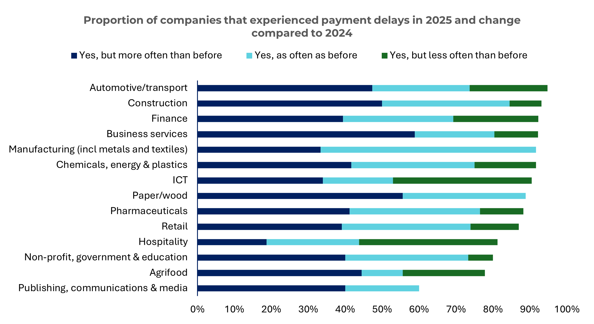 Überfällige Forderungen sind für Firmen in UK zur Dauerbelastung geworden. Besonders betrifft dies Kleinst- und Kleinunternehmen: Fast die Hälfte von ihnen berichtet eine Zunahme der Zahlungsverzögerungen gegenüber dem Vorjahr. Bei mittelgroßen Unternehmen liegt dieser Anteil bei 39 Prozent, bei großen bei 42 Prozent. Am stärksten betroffen sind die Bauwirtschaft sowie die Automobil- und Transportindustrie: 95 bzw. 93 Prozent der Firmen in diesen Branchen melden verspätete Zahlungen.
