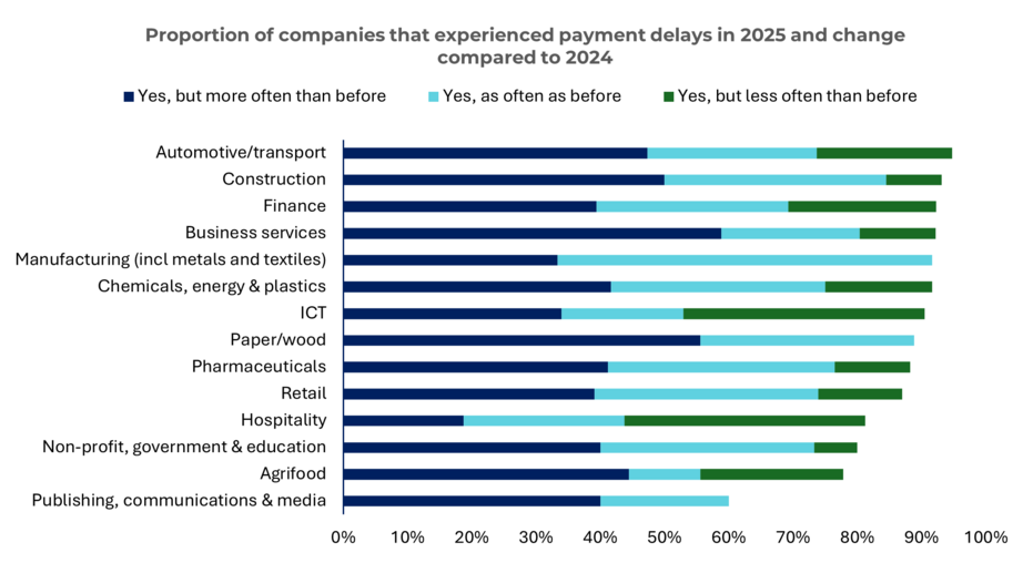 Der durchschnittliche Zahlungsverzug liegt über alle Unternehmensgrößen hinweg bei 32 Tagen. Die längsten Verzögerungen wurden im Bausektor mit 38 Tagen gemeldet, die kürzesten in der Verlags- und Medienbranche mit 21 Tagen.